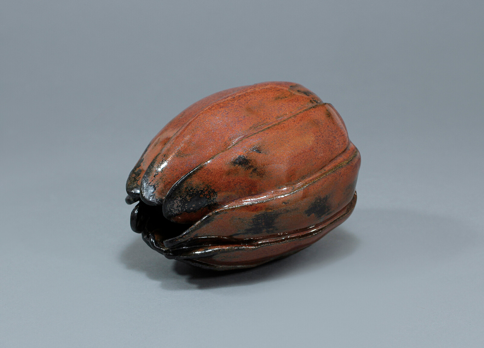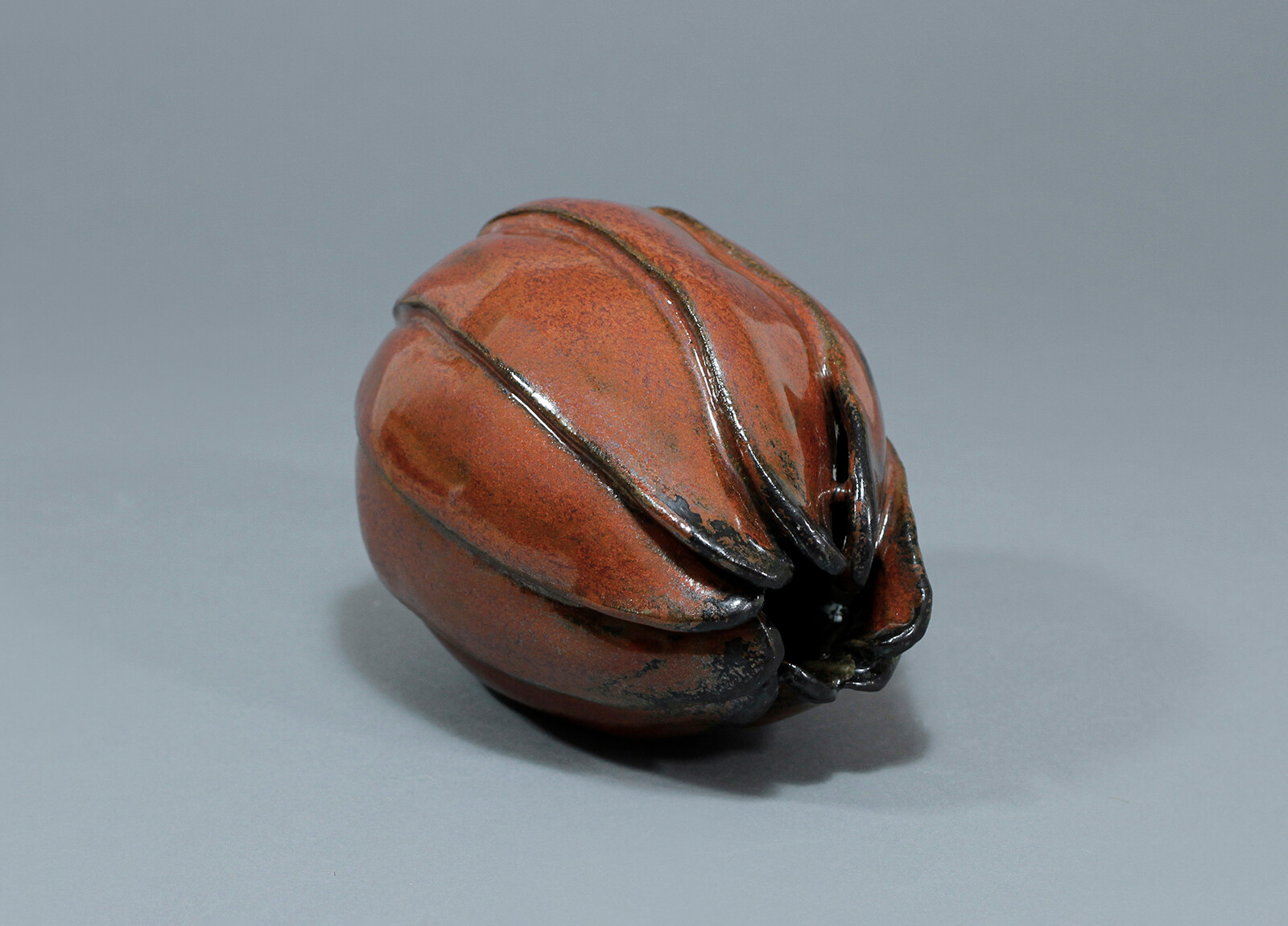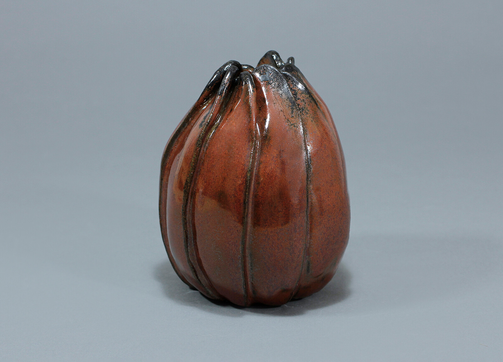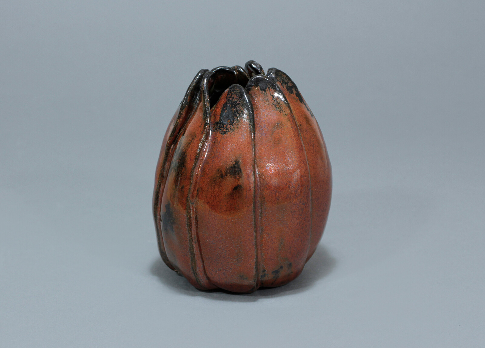 Mały wazon ręcznie lepiony, o zamkniętej, organicznej formie inspirowanej pąkiem, z wyraźnie zaznaczonymi, pionowymi podziałami. Powierzchnia utrzymana jest w ciepłym, ceglastym odcieniu z ciemnymi, niemal grafitowymi przetarciami, które dodają głębi. Szkliwo ma delikatny połysk i podkreśla rzeźbiarski charakter bryły. Niewielki otwór sprawia, że najlepiej prezentuje pojedynczy kwiat lub drobna kompozycja.