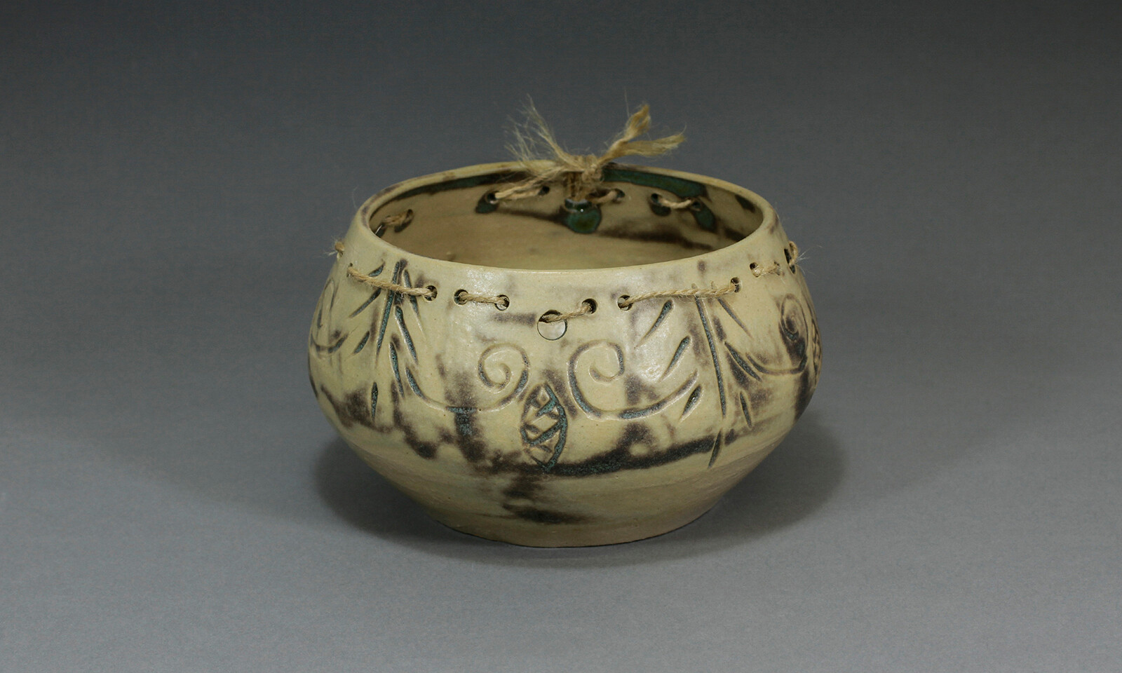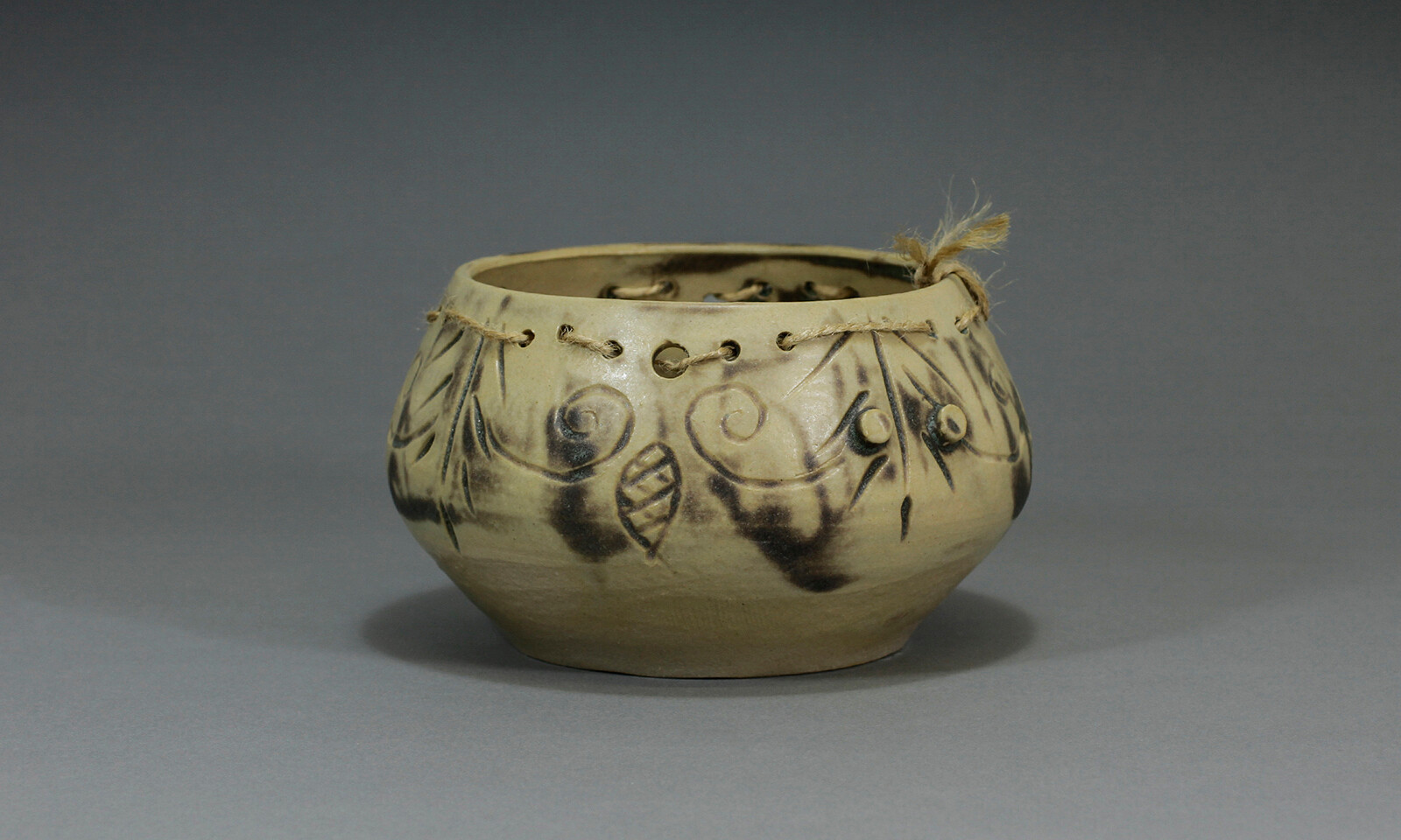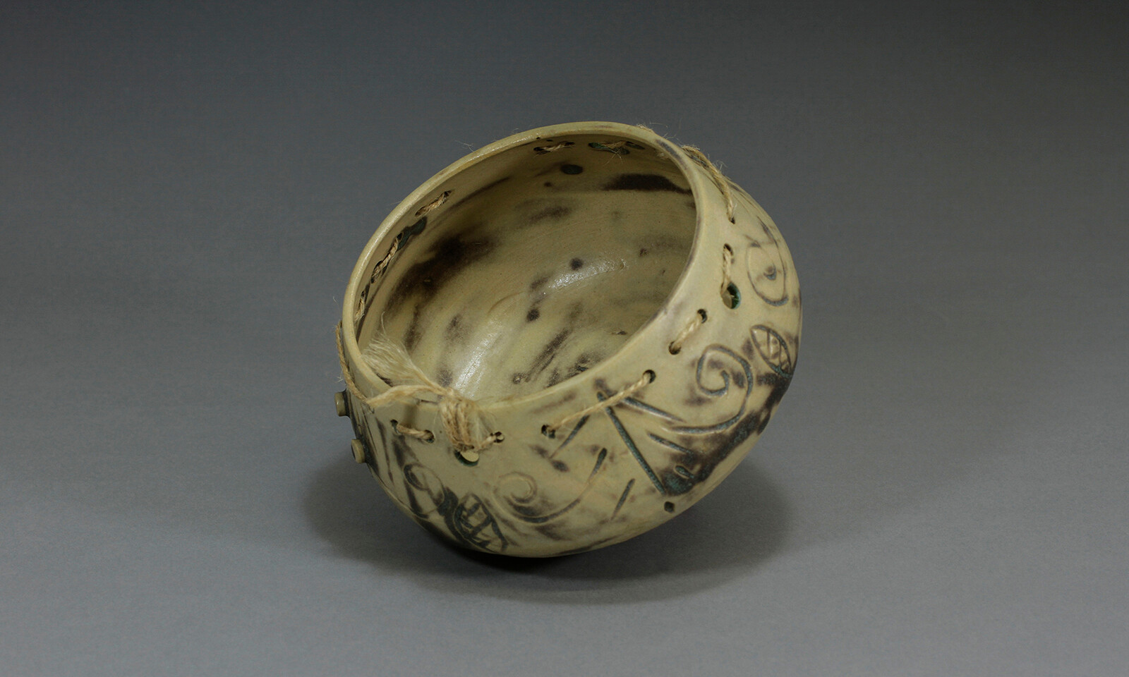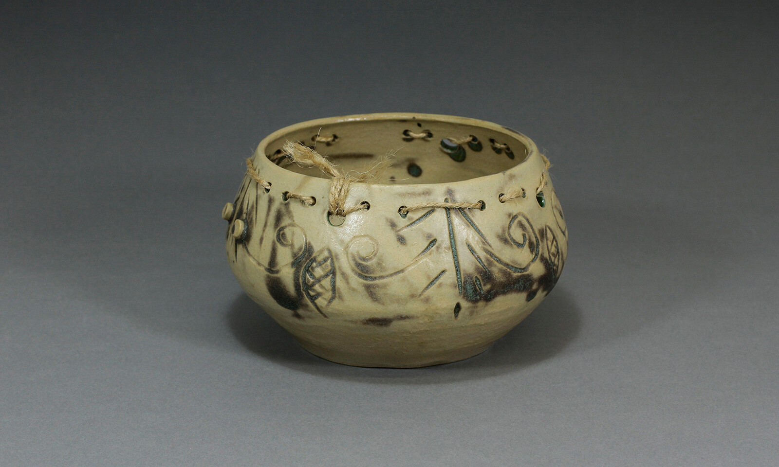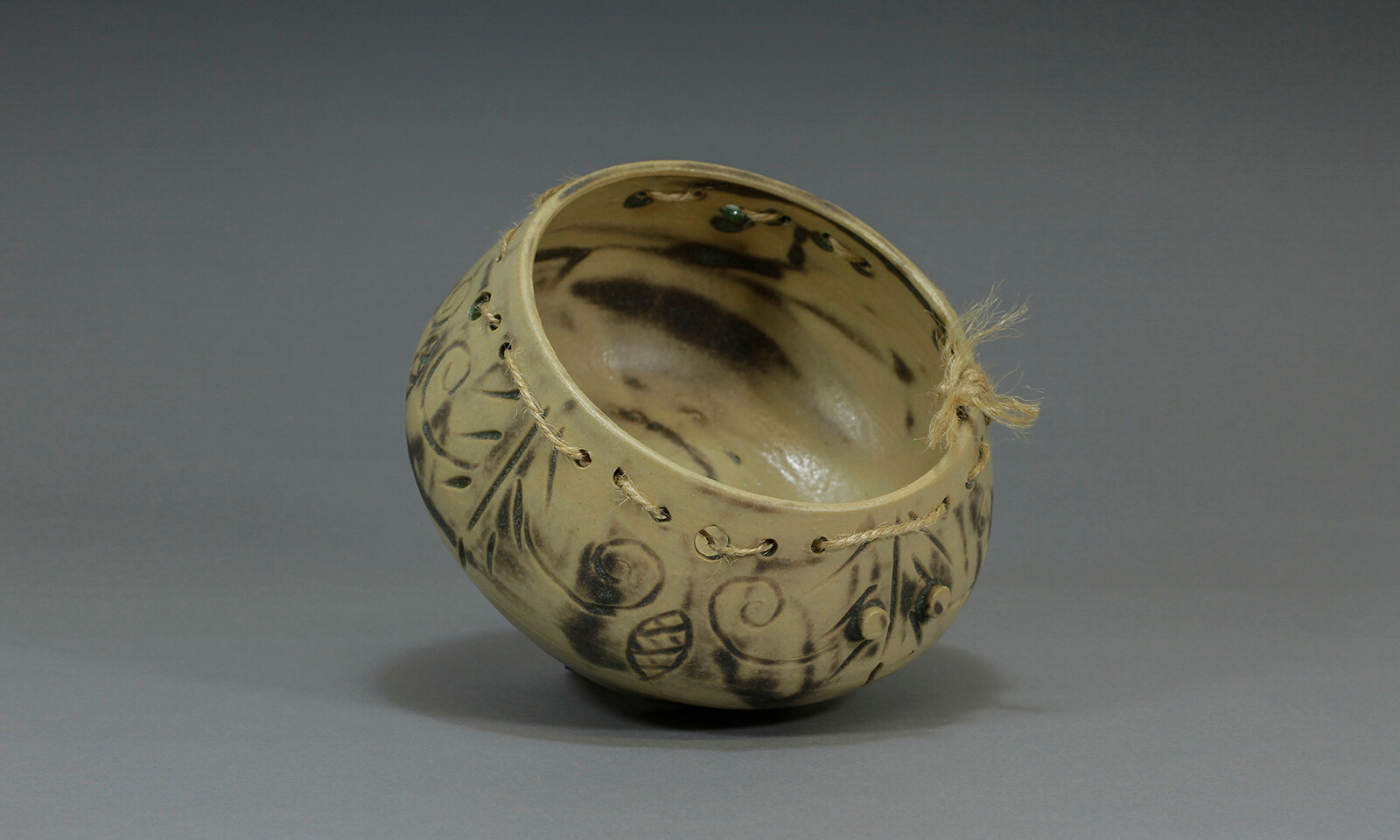 Ręcznie wykonana misa z jasnej gliny, zdobiona rytmicznymi, ciemnymi wzorami oraz dekoracyjnym sznurkiem przewleczonym przez otwory przy krawędzi. Naturalna kolorystyka i widoczne ślady ręcznej pracy nadają jej wyrazisty, rzemieślniczy charakter. Idealna jako osłonka na roślinę, pojemnik na drobiazgi lub oryginalny element dekoracyjny do wnętrz w stylu naturalnym i boho.