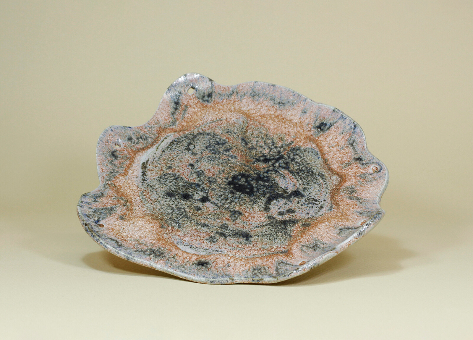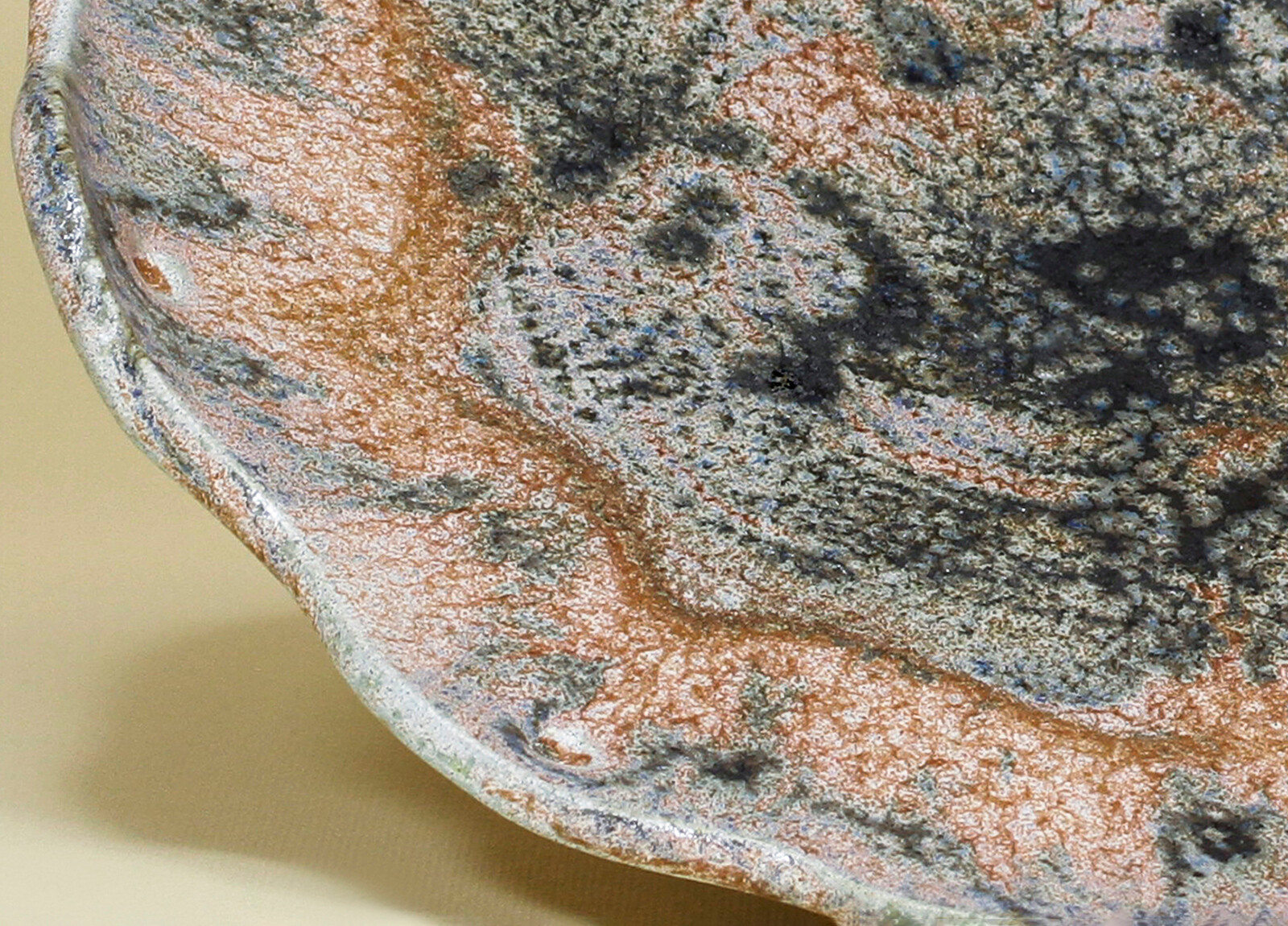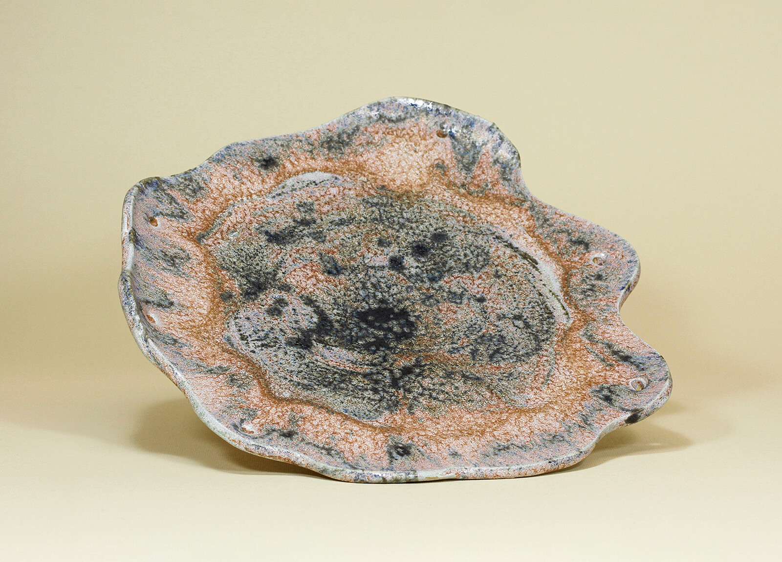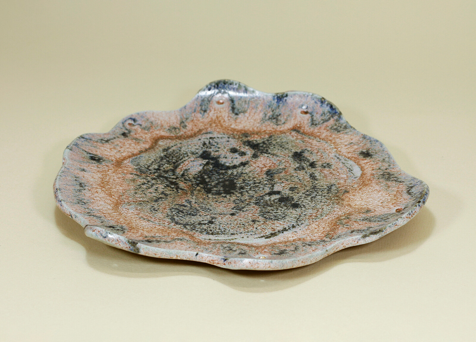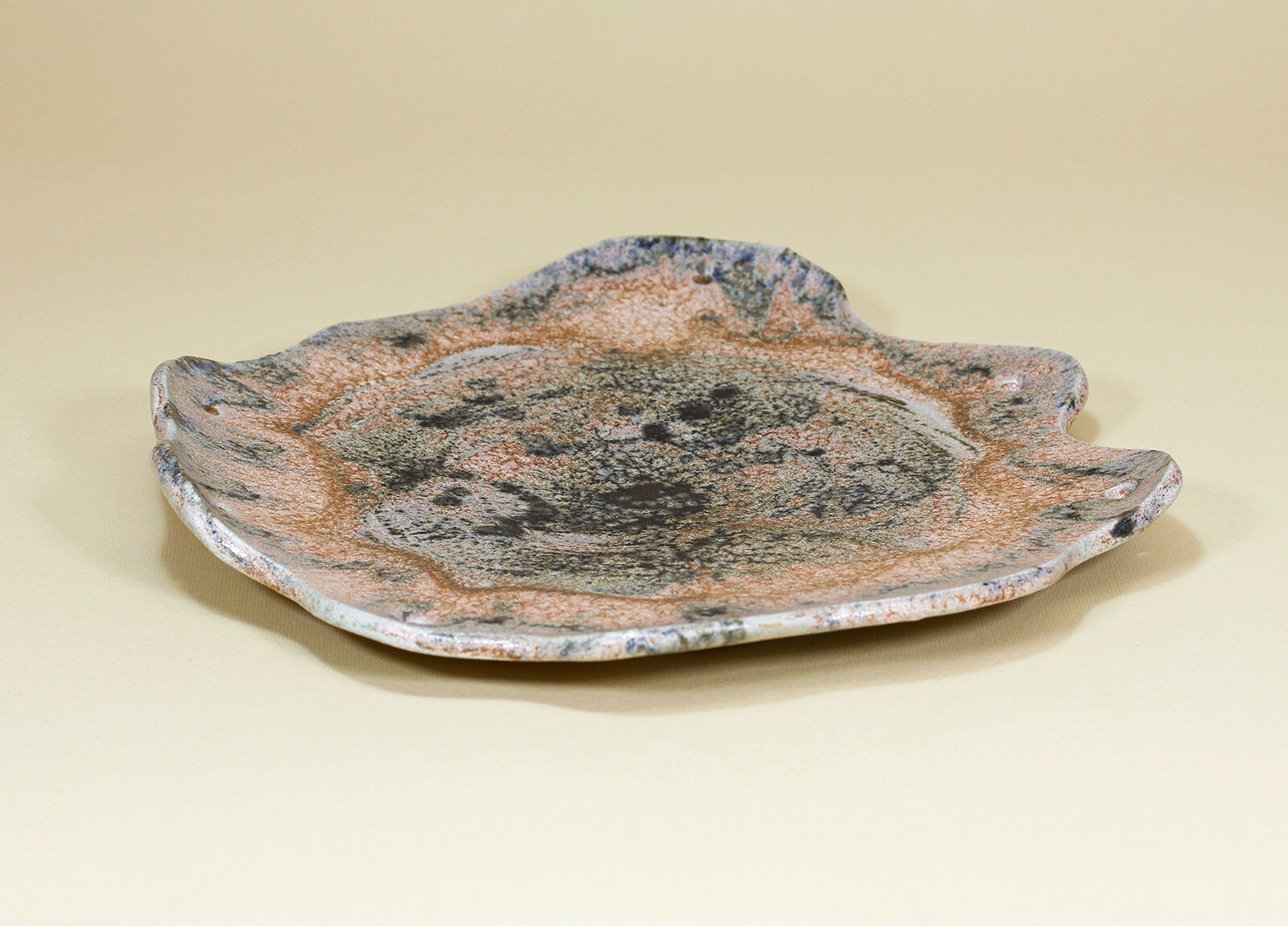 Ręcznie wykonana patera o nieregularnym, falującym obrysie i płytkiej formie. Delikatnie unosząca się krawędź porządkuje powierzchnię i nadaje całości miękki rytm. Widoczne ślady, oraz zróżnicowana faktura są efektem procesu wypału. Szkliwo łączy stonowane odcienie jasnej gliny z przygaszonymi akcentami grafitu i błękitu.