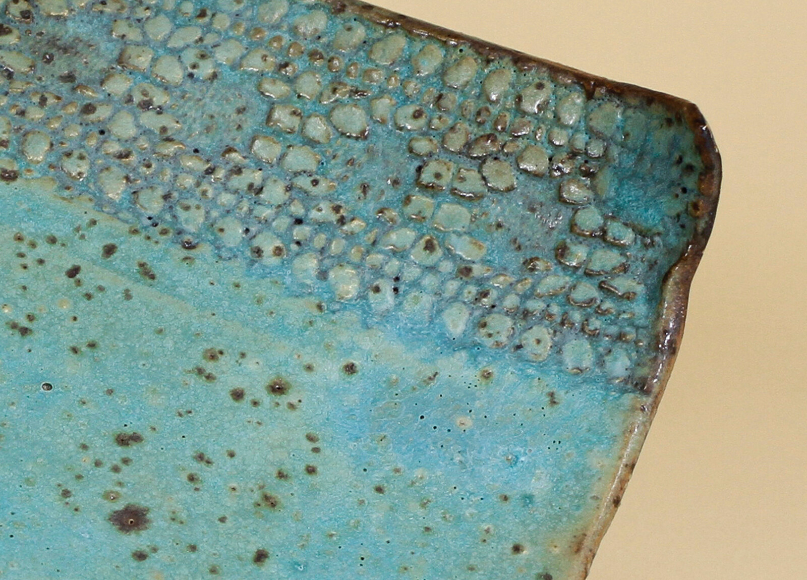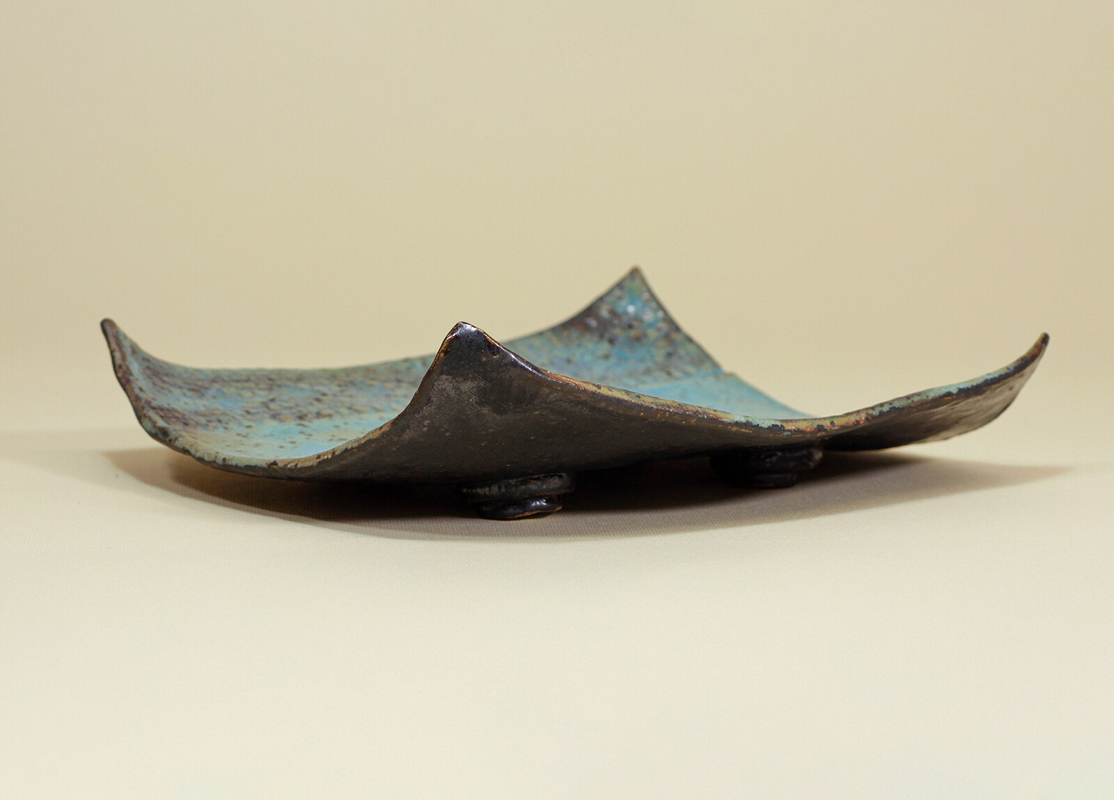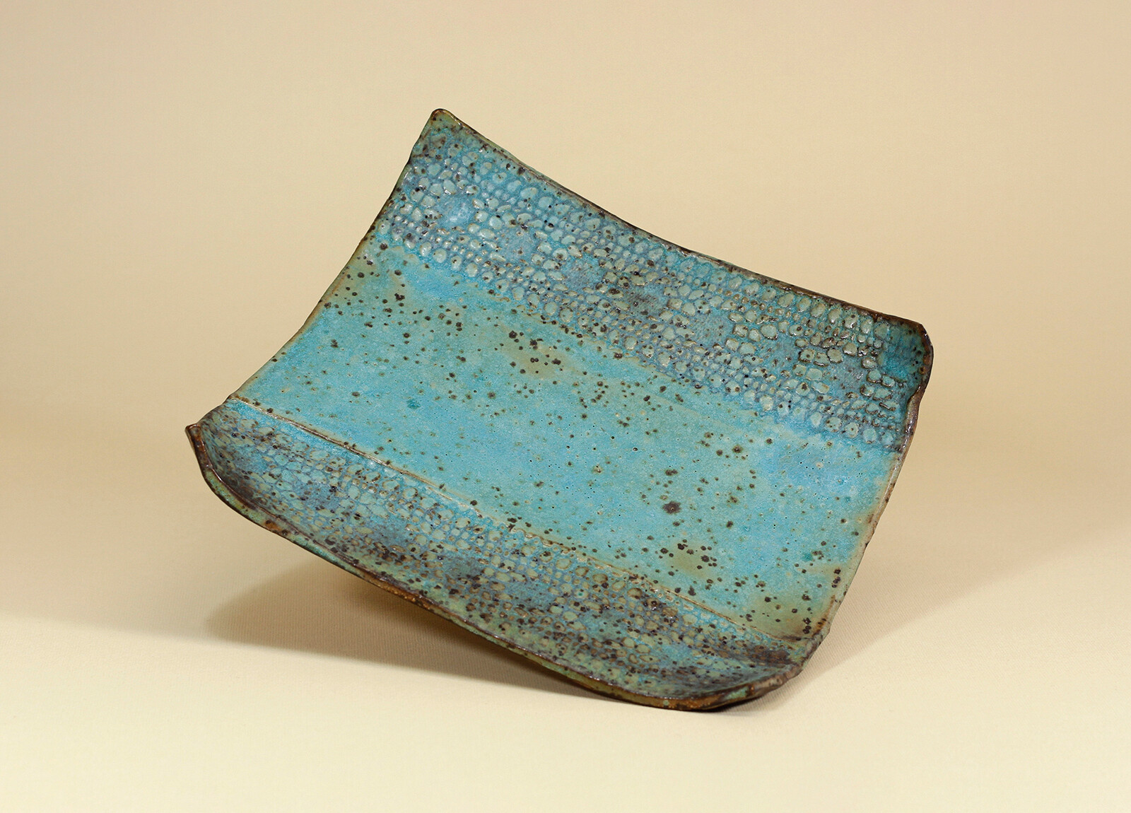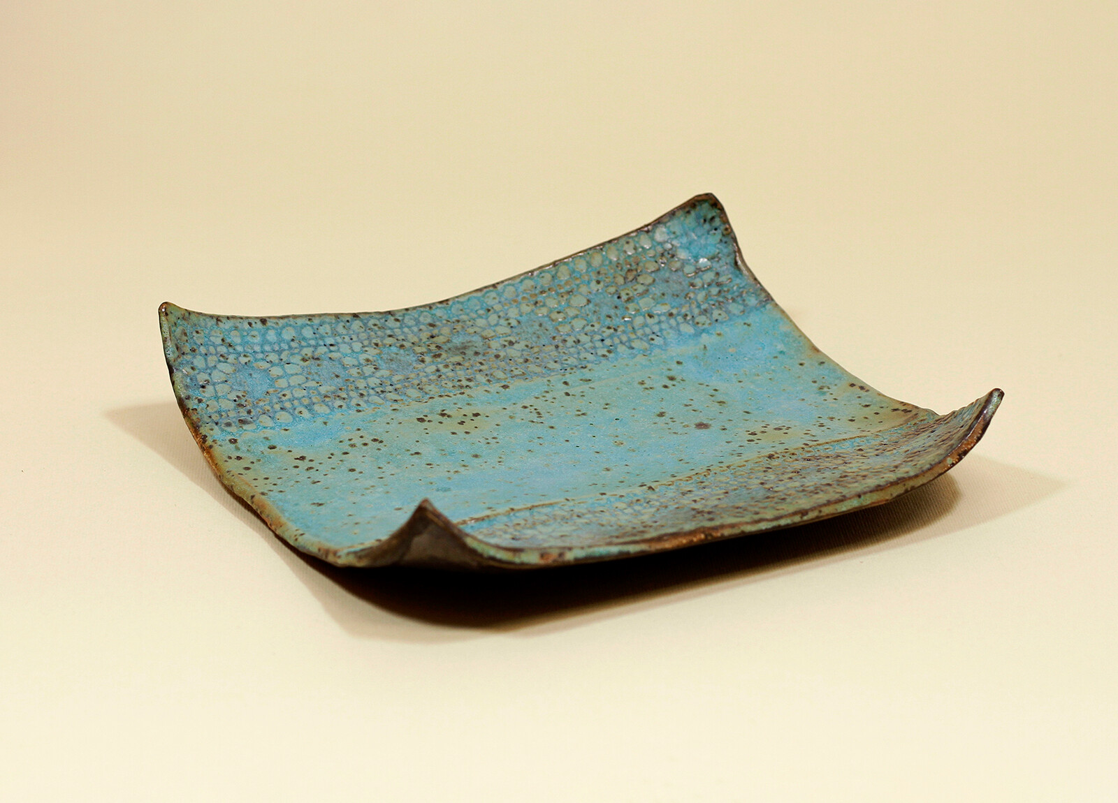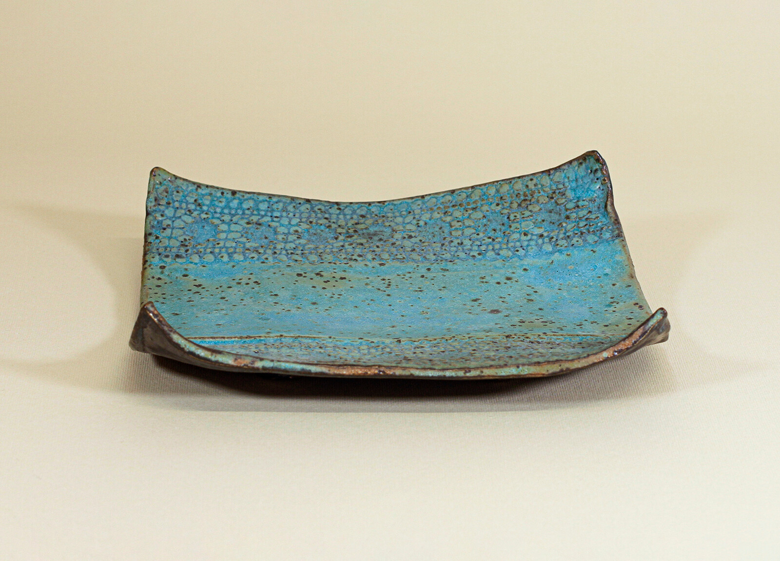 Ręcznie wykonana patera, w odcieniach błękitu, o prostokątnym zarysie i lekko podniesionych bokach. Nieregularna linia krawędzi oraz delikatne załamania formy nadają jej wyraźną sylwetkę. Powierzchnia z widocznymi śladami pracy i naturalnymi efektami wypału.