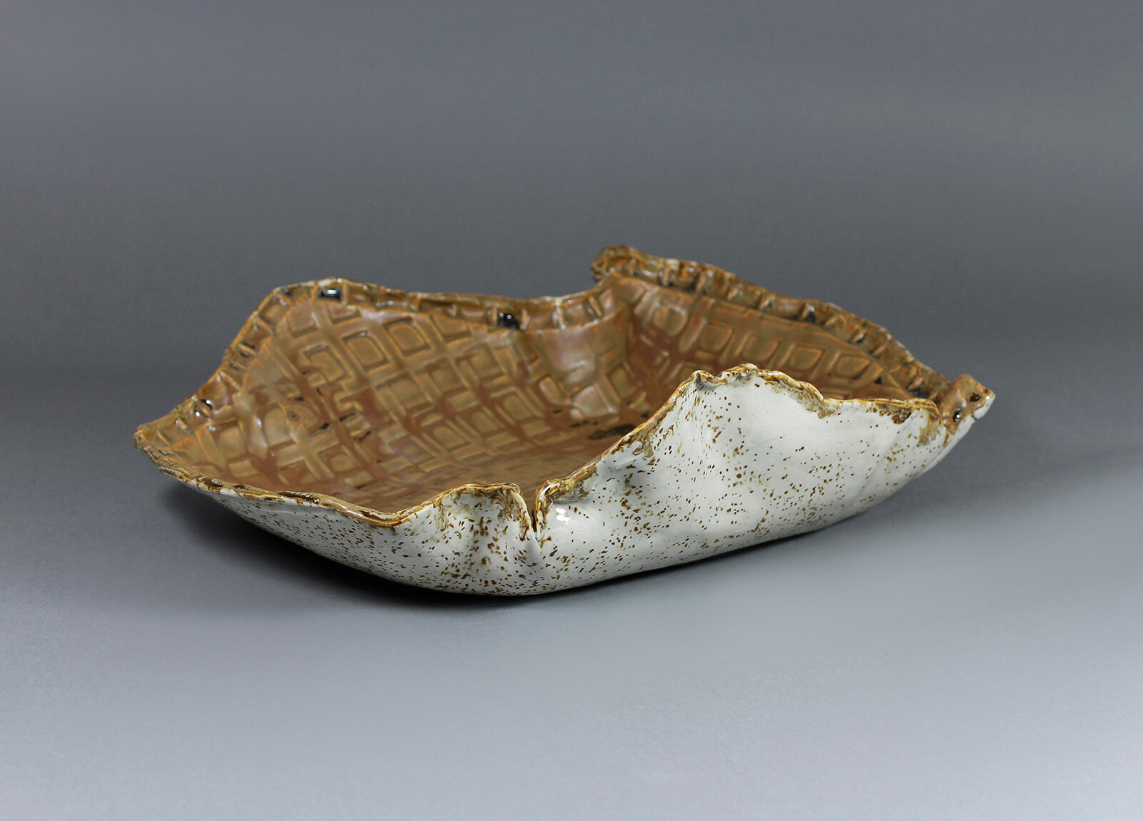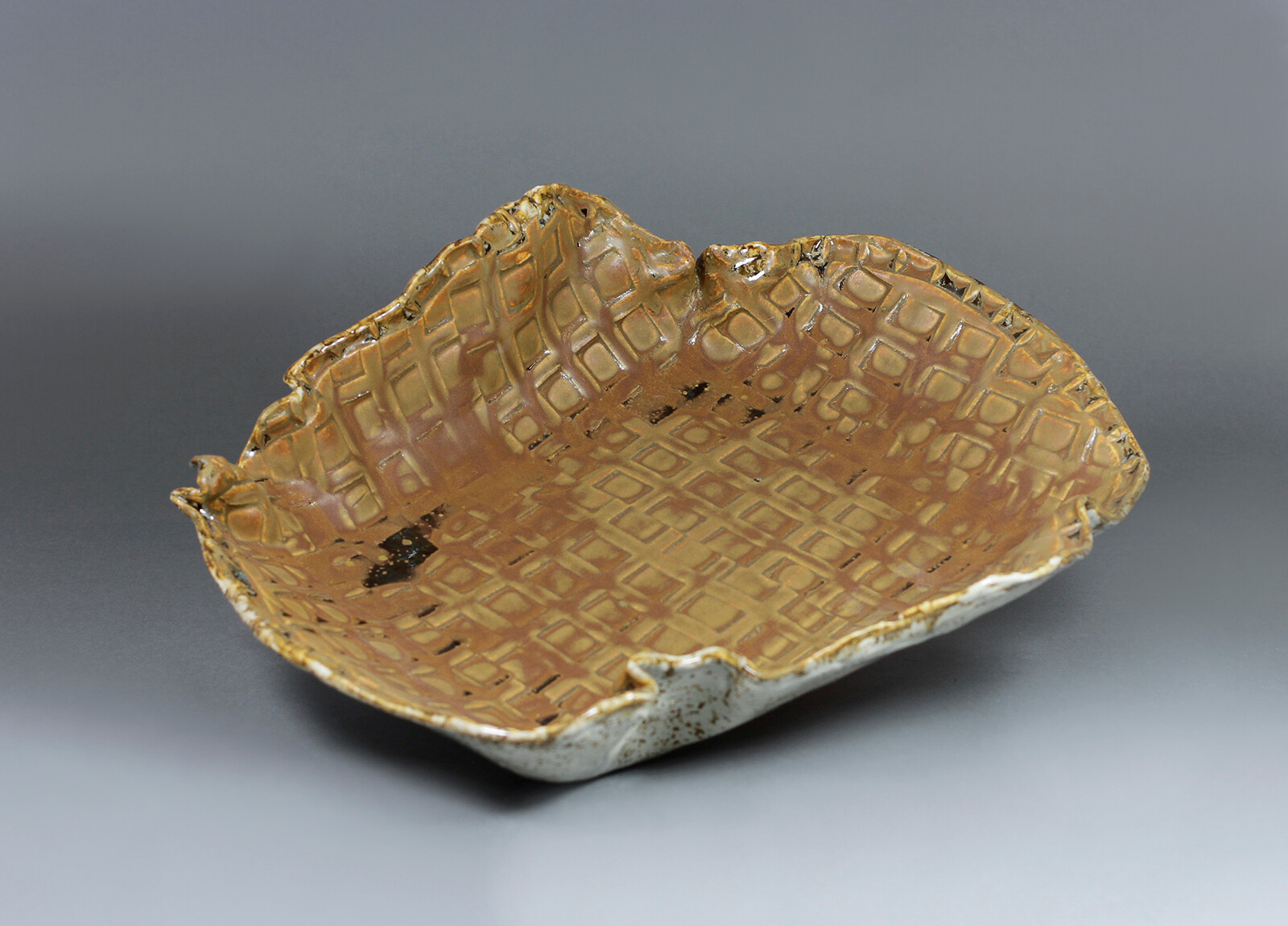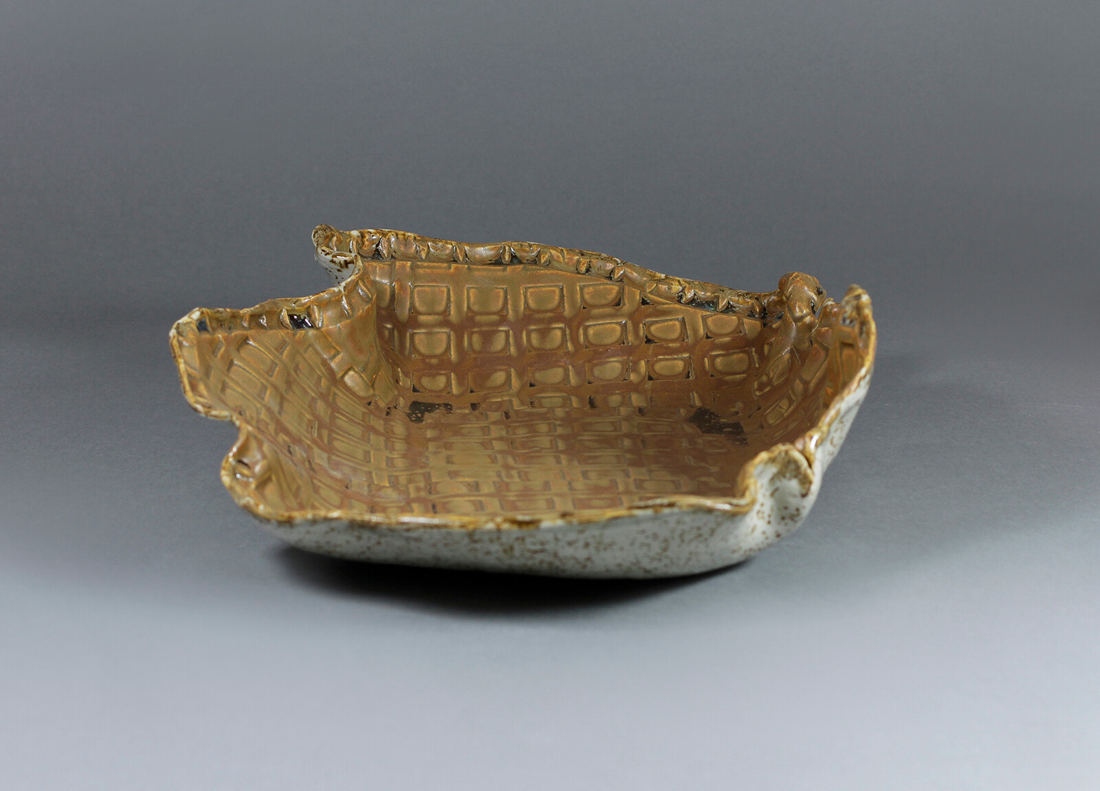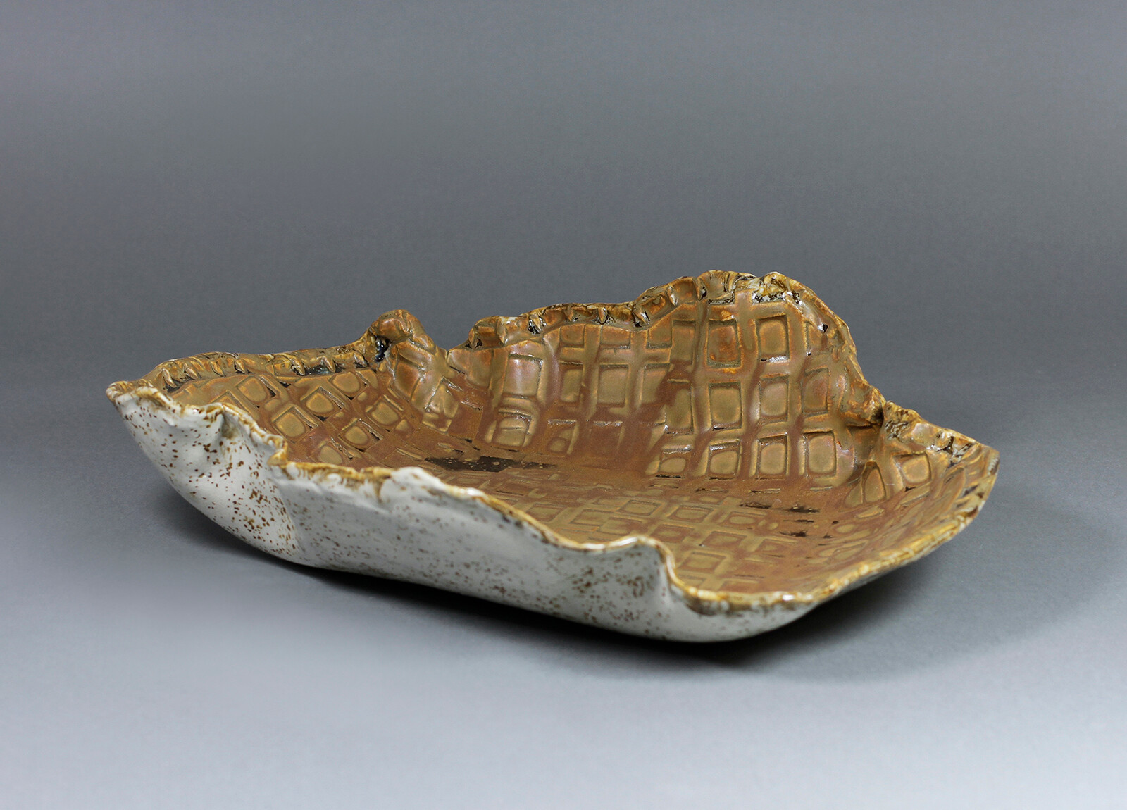 Ręcznie robiona patera o nieregularnych brzegach, przyciąga uwagę swobodną i organiczną linią. Wnętrze pokrywa ciepły, miodowo-brązowy odcień z wyraźnym, geometrycznym rysunkiem faktury, który nadaje całości charakteru. Zewnętrzna strona utrzymana jest w jasnej, kremowej tonacji z drobnymi, kontrastowymi nakropieniami. Doskonała do serwowania, ale równie dobrze funkcjonuje jako wyrazisty element dekoracyjny.