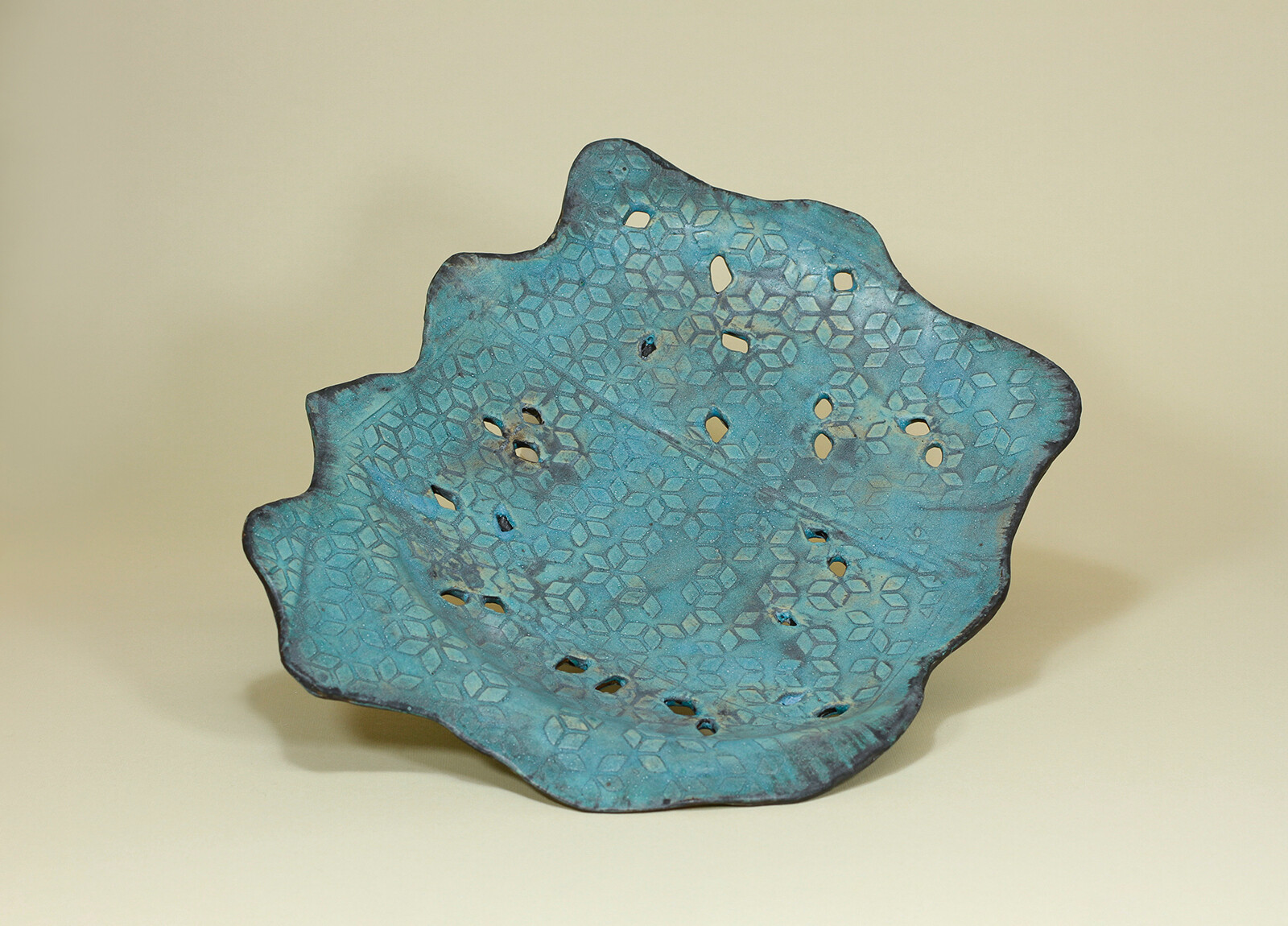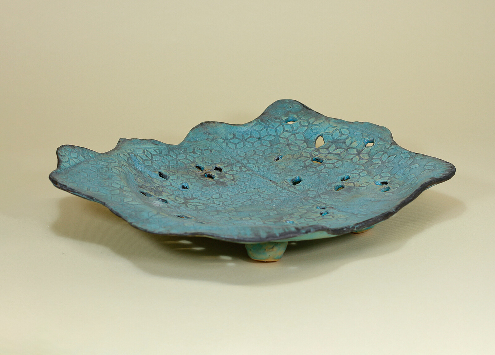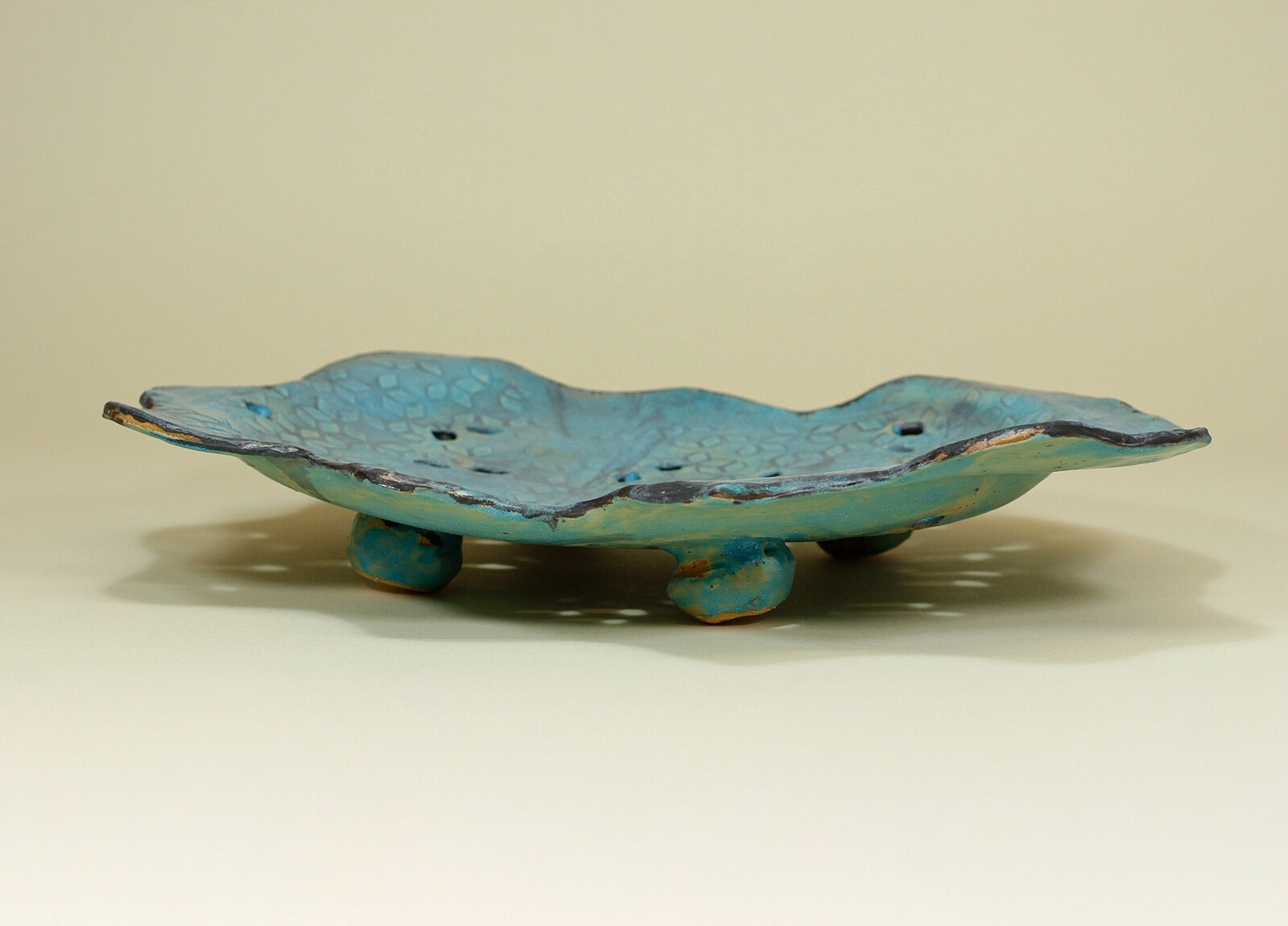 Ręcznie wykonana patera, na nóżkach, o swobodnie falującej, nieregularnej krawędzi. Intensywny turkus przełamany jest ciemniejszymi przetarciami, co podkreśla głębię szkliwa i jego zróżnicowaną powierzchnię. Delikatny, geometryczny wzór oraz drobne perforacje nadają formie lekkości i dekoracyjnego charakteru. Sprawdzi się jako element do serwowania lub efektowna ozdoba stołu.