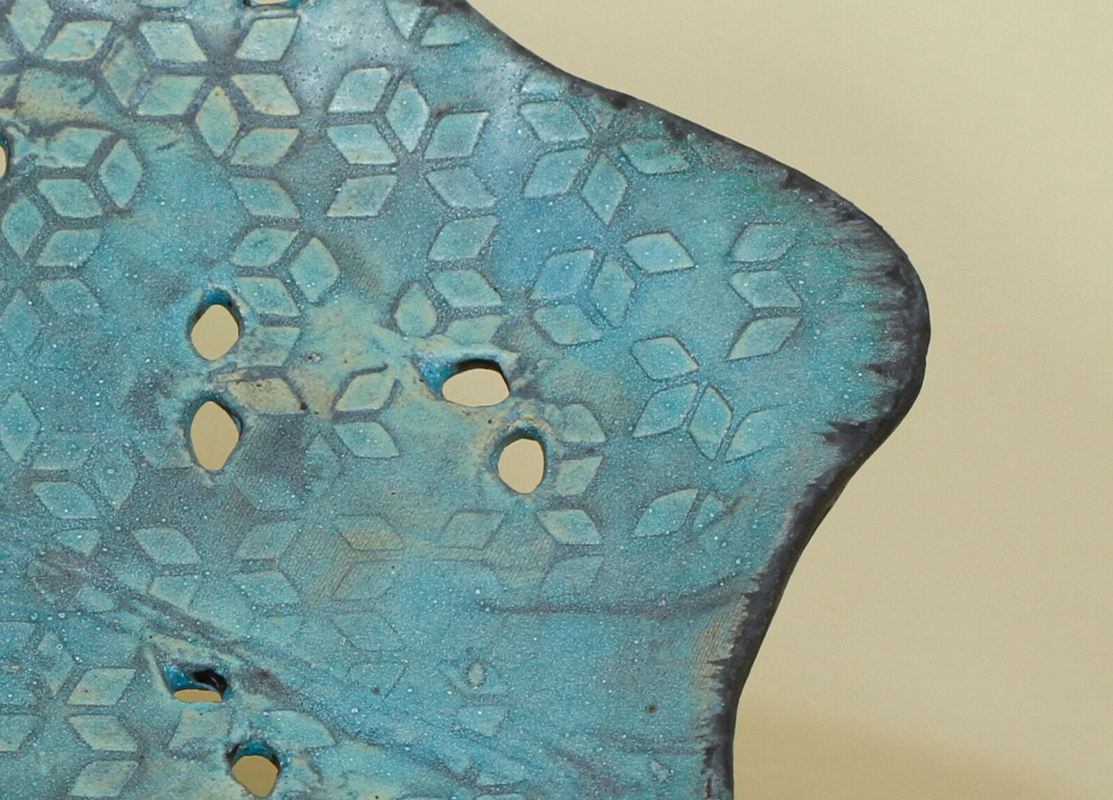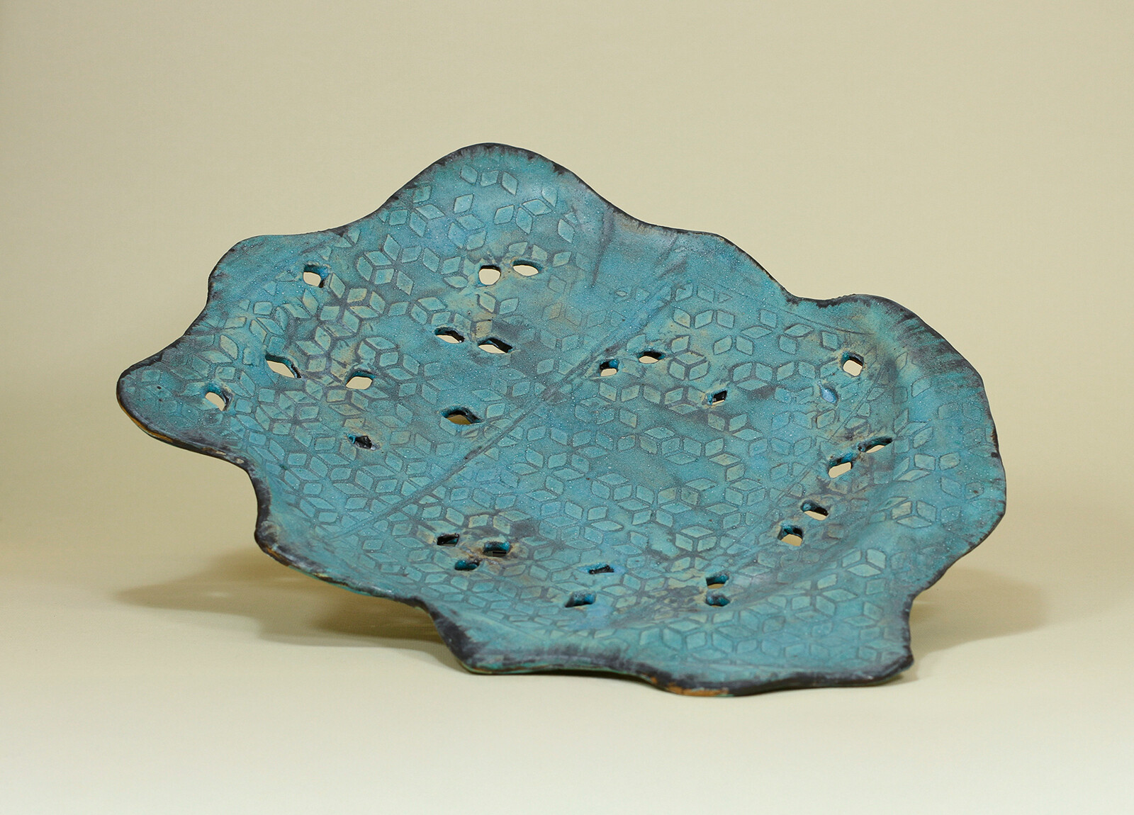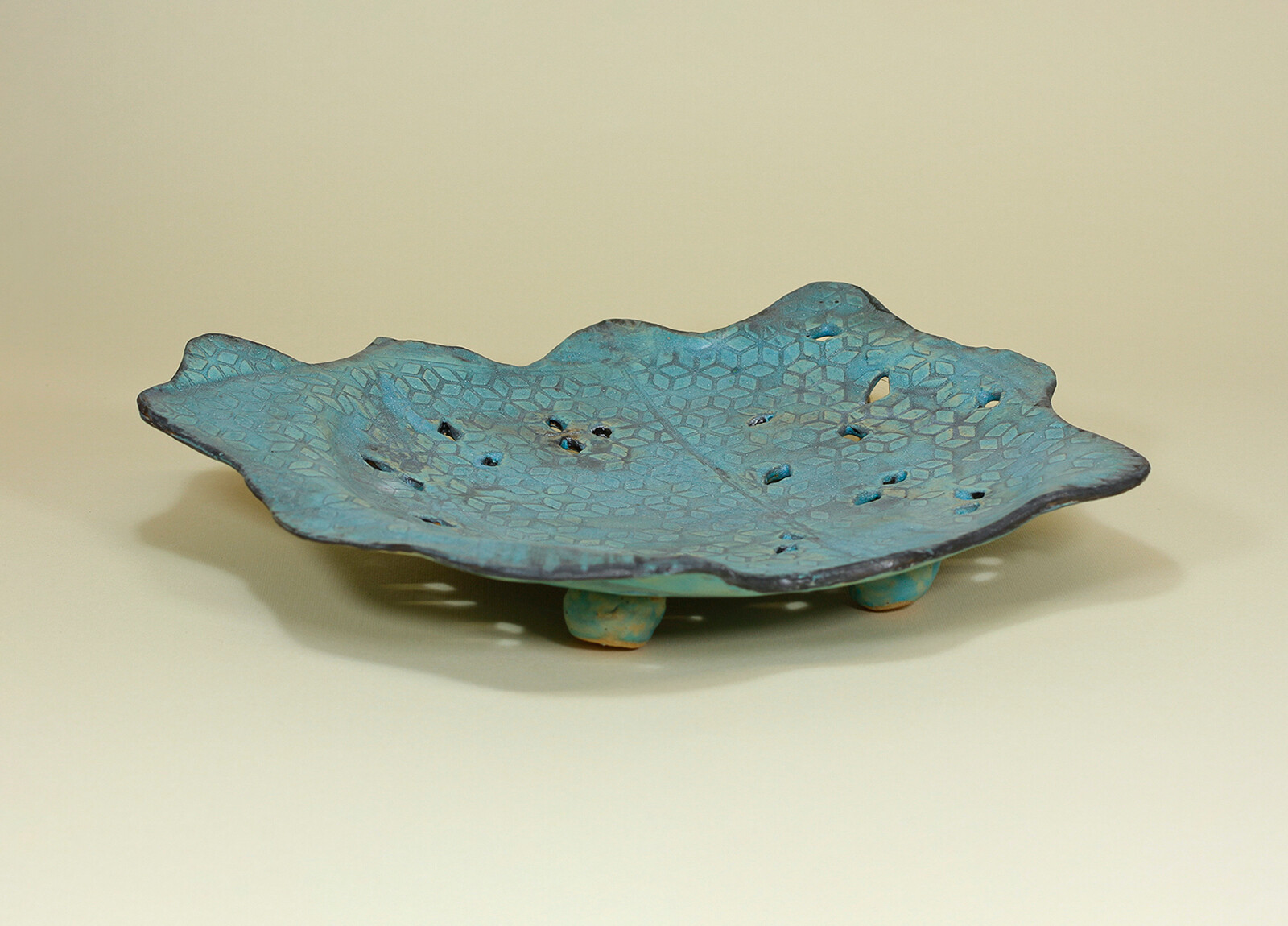 Ręcznie wykonana patera, na nóżkach, o swobodnie falującej, nieregularnej krawędzi. Intensywny turkus przełamany jest ciemniejszymi przetarciami, co podkreśla głębię szkliwa i jego zróżnicowaną powierzchnię. Delikatny, geometryczny wzór oraz drobne perforacje nadają formie lekkości i dekoracyjnego charakteru. Sprawdzi się jako element do serwowania lub efektowna ozdoba stołu.